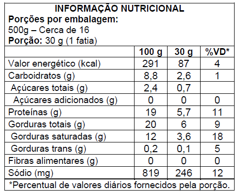 Queijo (leite pasteurizado padronizado, cloreto de sódio (sal), cloreto de cálcio, fermento lácteo, coagulante quimosina), requeijão cremoso (creme de leite, massa coalhada, cloreto de sódio (sal), estabilizante difosfato tetrassódico e polifosfato de sódio e regulador de acidez bicarbonato de sódio), água, amido modificado, leite em pó desnatado, proteína láctea, cloreto de sódio(sal), sais emulsionantes trifosfato pentassódico, estabilizante citrato trissódico, espessante carragena, regulador de acidez ácido cítrico e conservante sorbato de potássio. ALÉRGICOS: CONTÉM DERIVADOS DE LEITE. CONTÉM LACTOSE. NÃO CONTÉM GLÚTEN.